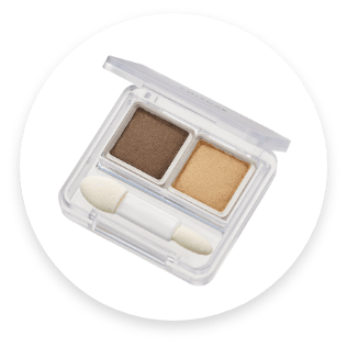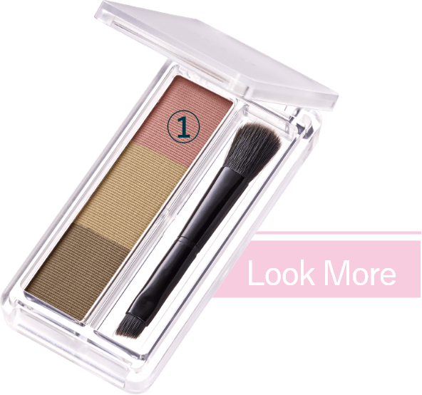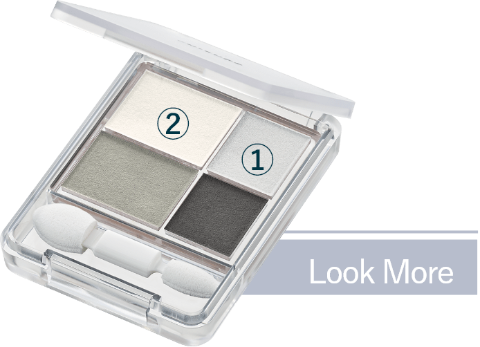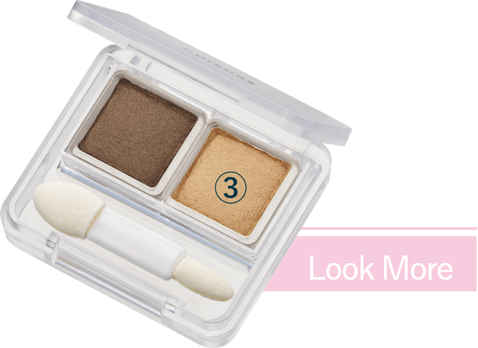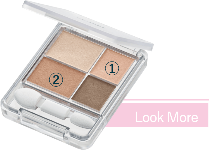 - 1「グラデーション アイシャドウ 74」①をアイホール全体にのばし、②を上まぶたの目頭から2/3までぬります。