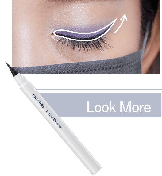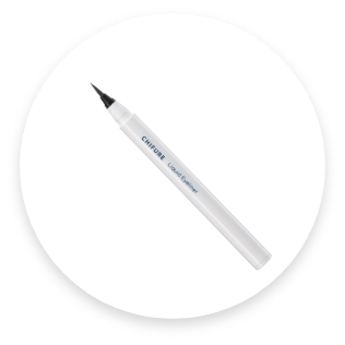 - 1「リキッド アイライナー 筆ペンタイプ BK30」で、目じりを少しはねあげるように描きます。